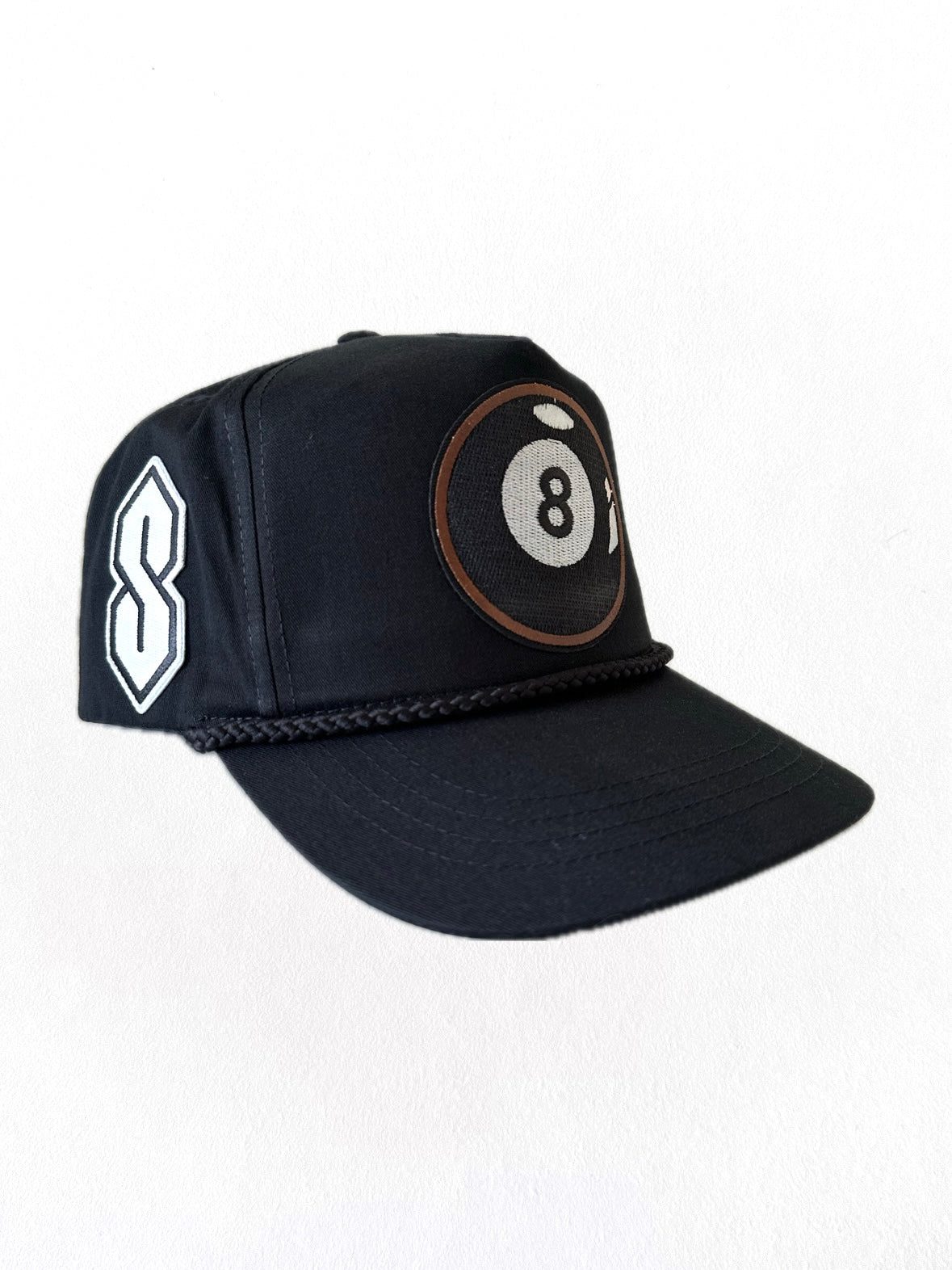 BLACK HIGH-PROFILE HAT, ADJUSTABLE MATCHING SNAPBACK, IRON-ON "8 BALL" PATCH AT THE FRONT, IRON-ON “S" PATCH AT THE RIGHT SIDE, REMOVABLE SAFETY PIN AT THE LEFT SIDE, SCREEN PRINTED "SL8R" AT THE BACK, BRAID ON VISOR, MATCHING UNDERVISOR