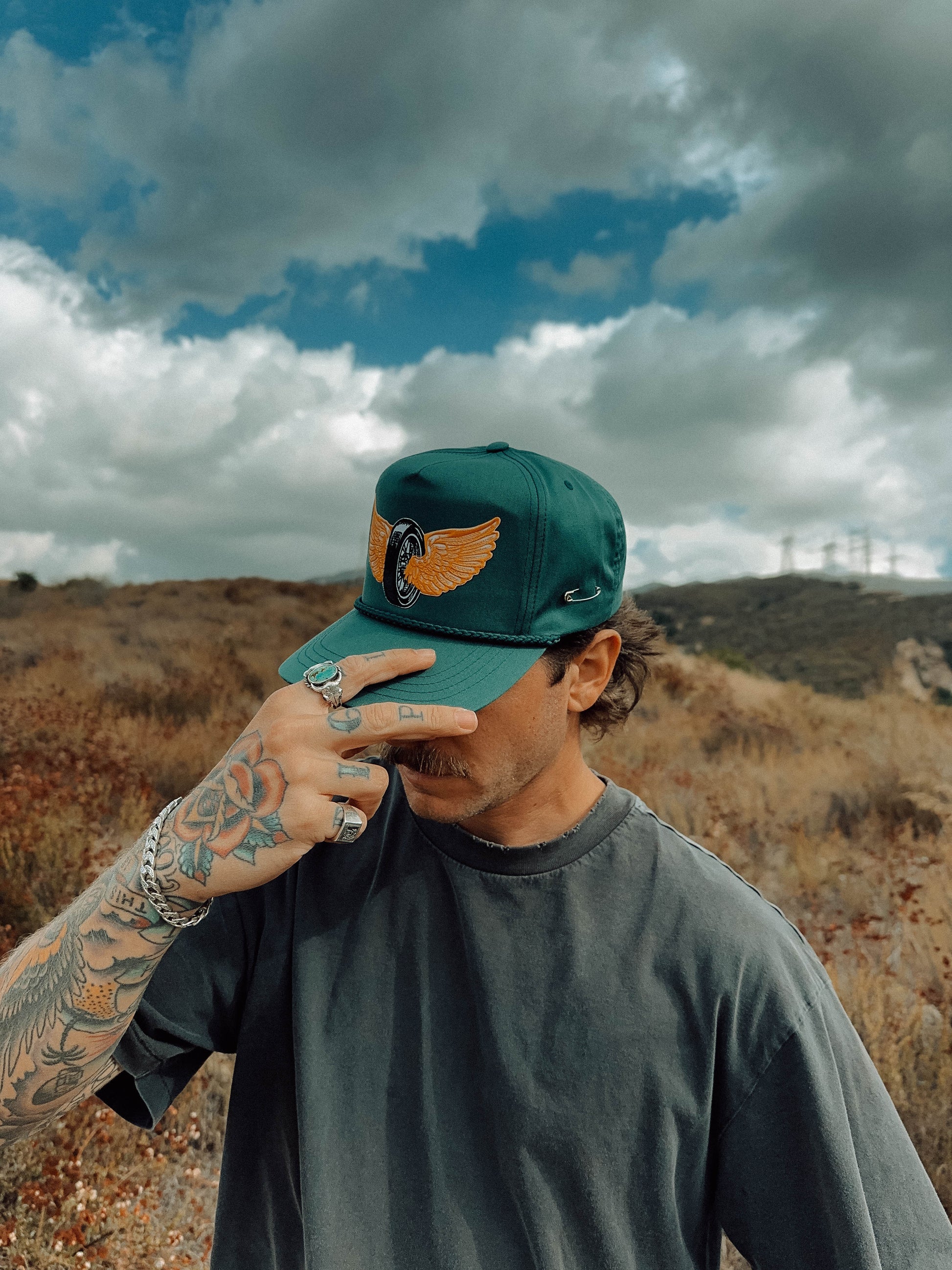 GREEN HIGH-PROFILE HAT, ADJUSTABLE MATCHING SNAPBACK, IRON-ON "WHEEL AND WINGS" PATCH AT THE FRONT, SCREEN PRINTED "SL8R" AT THE RIGHT SIDE, REMOVABLE SAFETY PIN AT THE LEFT SIDE, BRAID ON VISOR, MATCHING UNDERVISOR